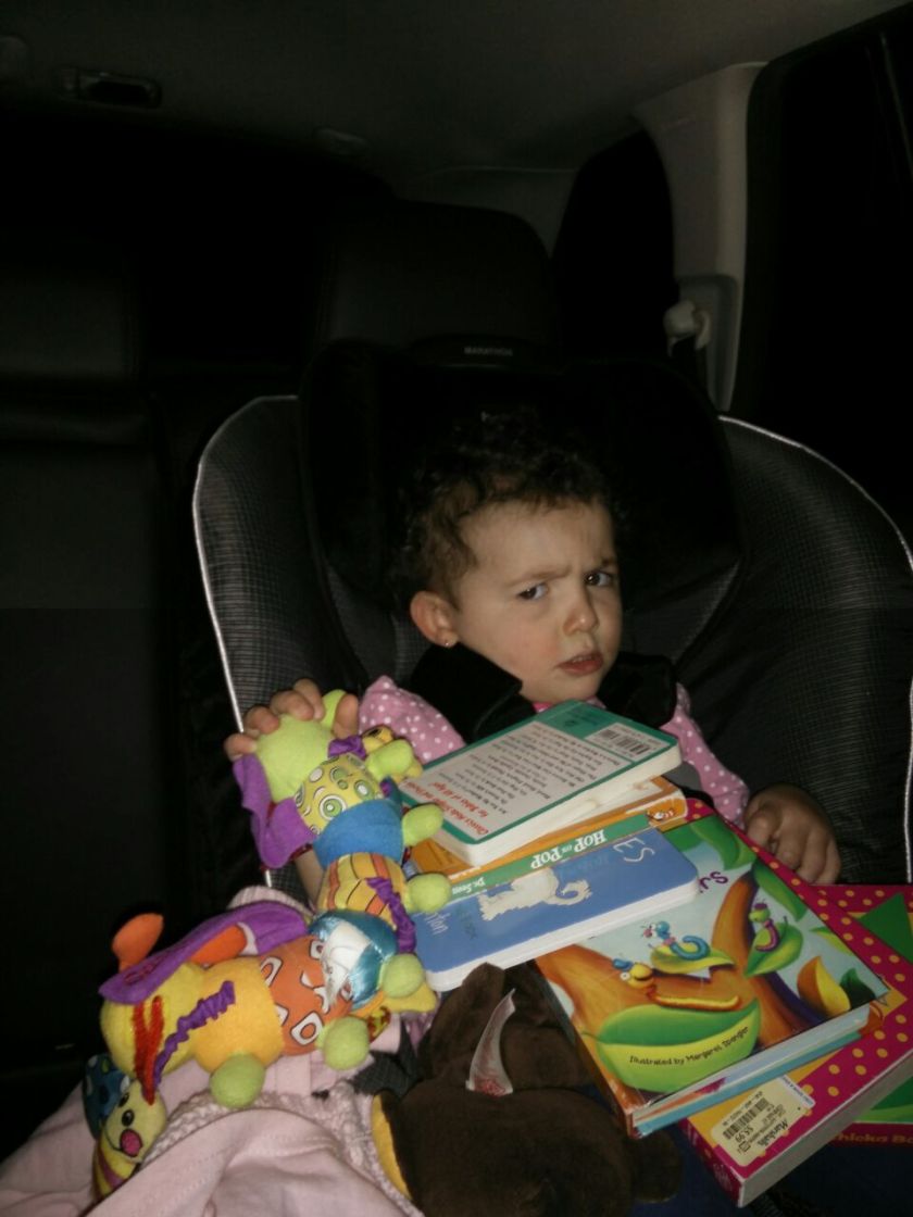 She was excited to get all her books in the car, but not so happy about having her picture taken.