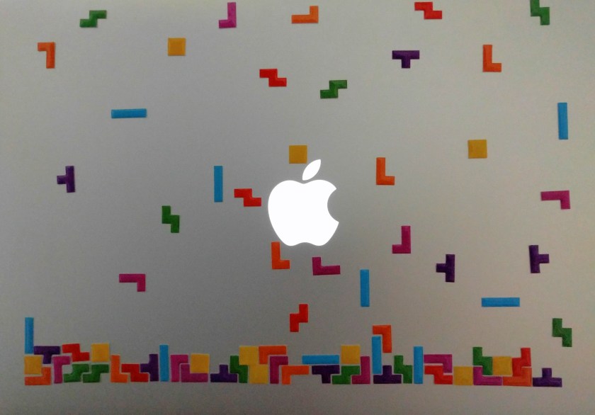 My company bought me a Macbook for work. I’ve never owned one before, but I’m excited to be a part of the cool club. The first step is owning a Macbook. Check. The second step is covering it in stickers. When I first got the machine I really didn’t plan on doing this, since it really is sort of a cliche about Macbook owners…but the more I thought about it the less I cared. The wide open space of the laptop lid is just begging to be decorated. It took a while for me to decide what to put on there. I considered miscellaneous beer stickers, but I didn’t want to be “the beer guy.” Then I remembered that a few months ago my Loot Crate had come with a large batch of Tetris stickers.