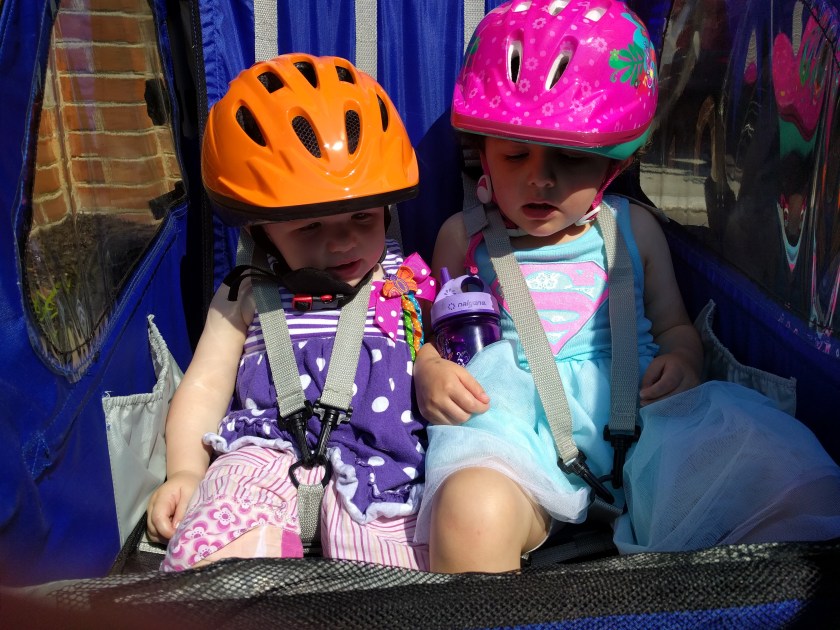 That’s how far we made it. Today was the first time we’d had a chance to try and take both girls out in the bike trailer, and they both seemed to really enjoy it at first. But before we even made it out of the neighborhood Valentina started screaming and we had to stop and go back. It was really hot today, so I think she was just overheating and uncomfortable. We took the helmet off and her hair was just plastered to her head. The same thing happened the first time I took Gia out by herself, and she loved it the very next day, so we just need to try again.