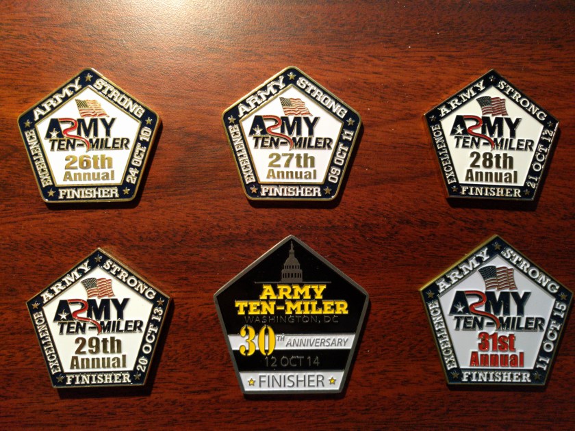 Pictured above are my finisher medals for the Army Ten Miler, which I’ve run for the past 6 years. I just signed up today for number 7, which means that next year I’ll officially qualify for priority registration as a long-time runner. That’s a pretty big deal, because normally the race sells out within the first hour or so of general registration, and it’s a race just to get signed up in time.