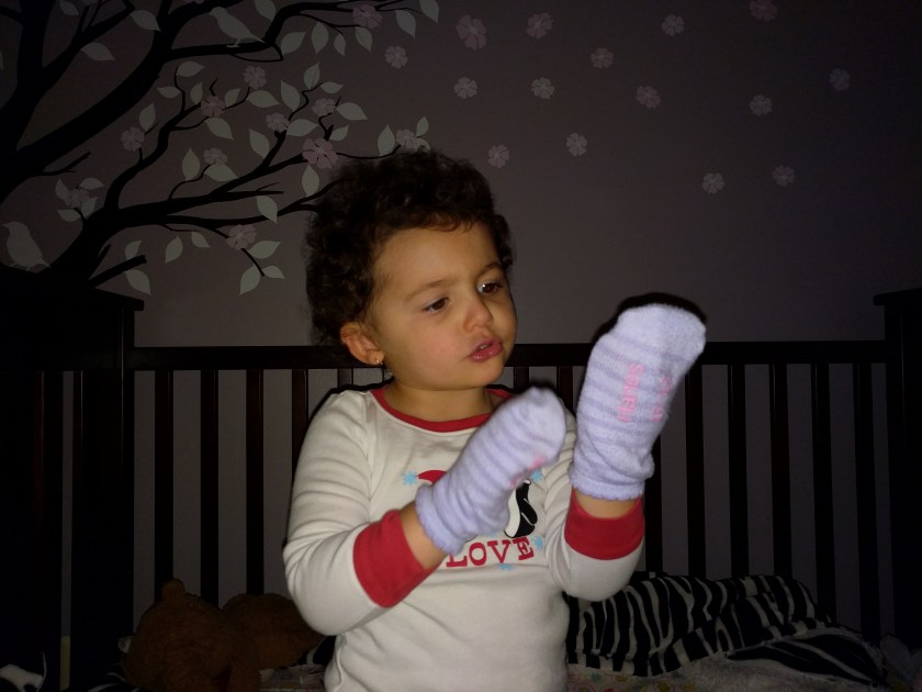 Recently Gia’s been asking for ice in her water bottle (which she takes to bed with her). The natural evolution from that is that she needs socks on her hands because the water bottle is too cold.
