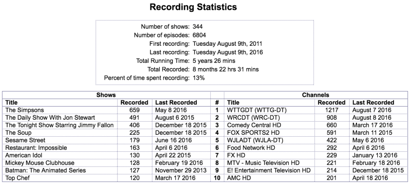 5 years ago today I first started running MythTV, an open-source home DVR solution. So I’m running my own computer instead of leasing a box from the cable company. Sure, there have been hiccups and maintenance headaches, but overall I much prefer having the personal control over my recordings. In the statistics above you’ll see that I recorded 659 episodes of The Simpsons during the FX Network’s Every Simpsons Ever marathon, which took up 1.5TB of disk space. Try doing that with your cable box! (Full disclosure – I held onto them for probably a year before I deleted them because I needed the space)